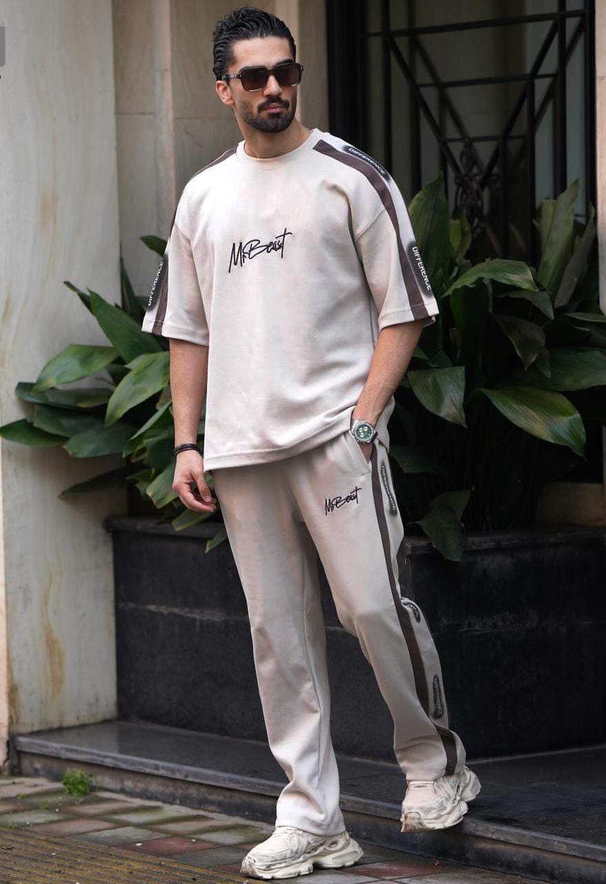 🔥Step up your streetwear game with the Urban Script Luxe Co-Ord statement-making duo in soft beige, with a punch of personality. This set features a signature MRBeast script, adding a distinct edge to both the tee and drawstring pants ✍️