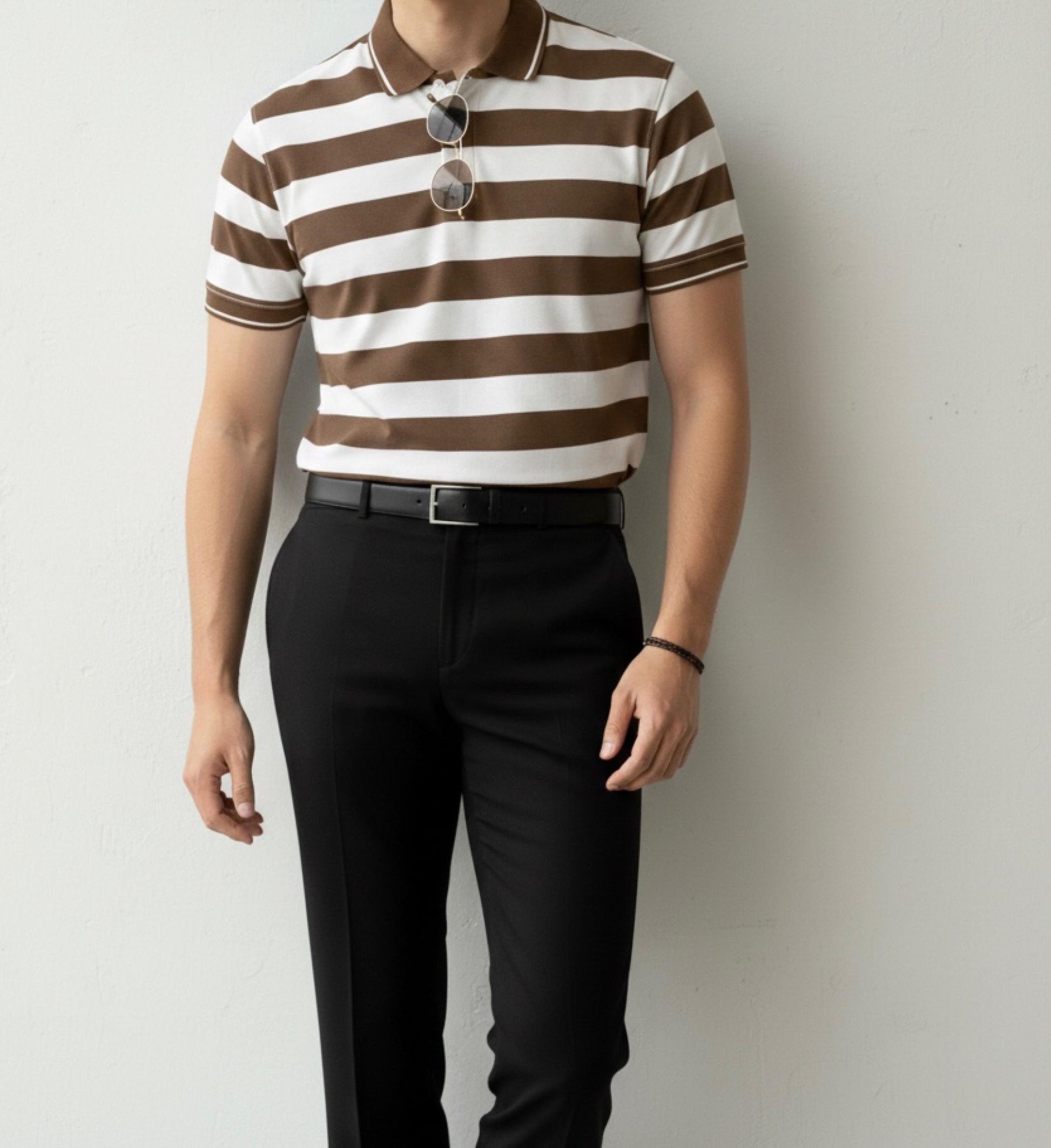 - Horizontal stripe pattern with collared neckline